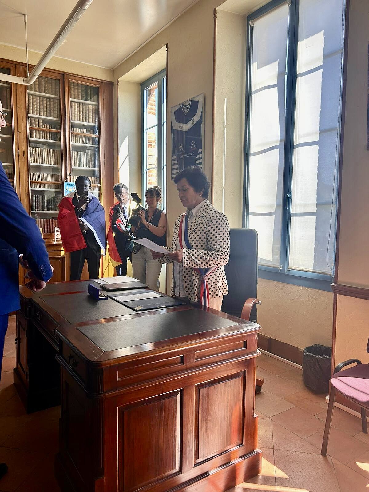La photo présente l’élue revêtue de l’écharpe tricolore avant la cérémonie. Pour respecter le droit à l’image, aucune photo du couple qui s’est uni ne sera publiée.